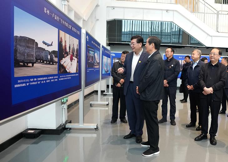 在位于鄭州航空港區(qū)的航投培訓(xùn)中心,劉奇葆首先參觀了“鄭盧‘空中絲綢之路’的探索與實踐”圖片展。張明超詳細介紹了35張圖片背后的故事和內(nèi)涵,匯報了“一帶一路”框架下鄭盧“空中絲路”的建設(shè)歷程和發(fā)展現(xiàn)狀。