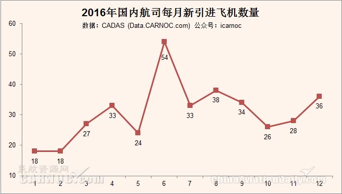 2016全年共引進(jìn)飛機(jī)369架,其中12月份新引進(jìn)飛機(jī)36架,6月份引進(jìn)數(shù)量最多,達(dá)到54架。