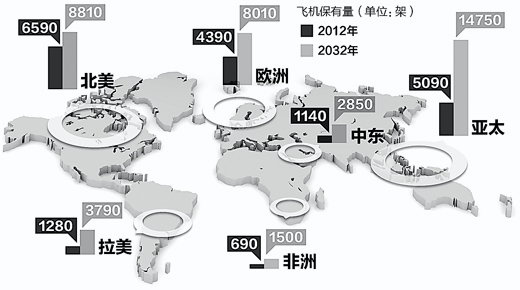 根據(jù)波音公司的預(yù)測,未來20年全球民機(jī)市場規(guī)模將翻一番,新興市場成為增長主動(dòng)力。到2032年,全球?qū)⑿略龀^3.5萬架飛機(jī),總額高達(dá)4.8萬億美元。亞太市場增幅最大,將新增1.282萬架飛機(jī),總額1.89萬億美元。其中,中國市場發(fā)展最為迅速。空客公司總裁兼首席執(zhí)行官密法布里斯·布利葉認(rèn)為,中國航空業(yè)的迅速發(fā)展是中國經(jīng)濟(jì)社會(huì)發(fā)展的必然產(chǎn)物,中國航空業(yè)發(fā)展的年均增速約為10%,同期全球航空業(yè)的增速則為5%。在未來20年,中國將成為世界最大的航空市場。