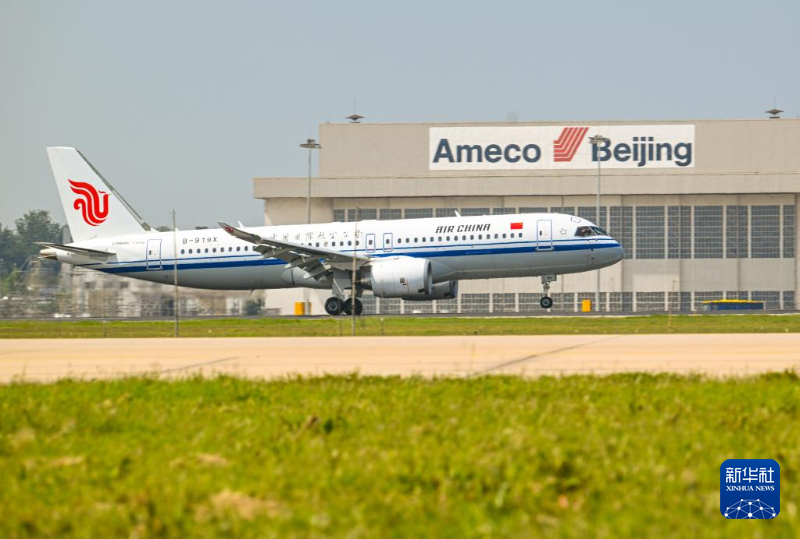 8月29日,國航首架C919國產(chǎn)大飛機(jī)降落北京首都國際機(jī)場。新華社記者 李賀 攝
