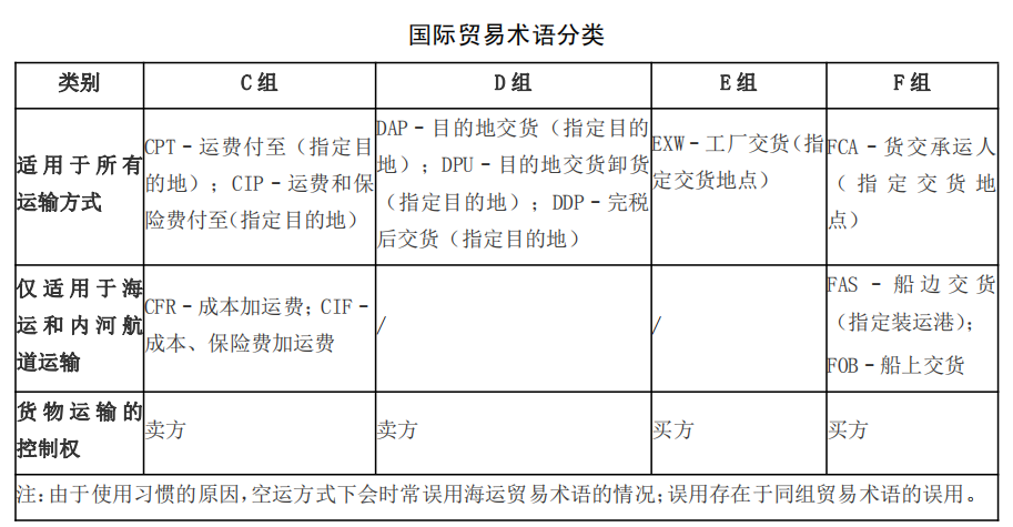 在國際貿(mào)易的貨物銷售合同中,進(jìn)出口商使用國際商會(huì)《國際貿(mào)易術(shù)語解釋通則》(Incoterms),界定買賣雙方在風(fēng)險(xiǎn)、成本、運(yùn)輸和保險(xiǎn)方面的義務(wù),避免誤解、爭議與因此導(dǎo)致的損失以及其他法律難題。根據(jù)最新的《國際貿(mào)易術(shù)語解釋通則》2020版,國際貿(mào)易術(shù)語共分成2類4組11個(gè)。